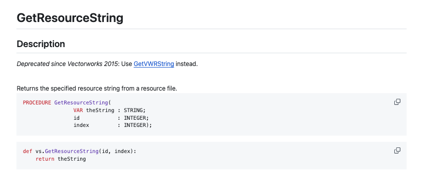 I see different ways to get a resource string. I am uncertain if i should use vs.GetResourceString('210 Folder', '1') or "vs.GetVWRString(res_path, '1')" Because GetResourceString has not much entries here in the forum and on github there is written somewhere " GetVWRString replaces GetResourceString" https://github.com/Vectorworks/developer-scripting/blob/main/Function Reference/Functions/GetVWRString.md And "depricated since 215" I think this could maybe be in context if the res_file changes from Vectorworks.vwr to someting else where the resource file path would have to be changed with SetVSResourceFile https://github.com/Vectorworks/developer-scripting/blob/main/Function Reference/Functions/GetResourceString.md What i want to reach is, getting the localised string of the Workspace Folder as example. Or the Localised Folder Name of MEP Tools. If i would use GetVWRString i had to tinker the path and dive into the zipped res folder on windows. Where GetResourceString seems to refer directly to a cached list of Vectorworks string resources. import os import sys import vs exe_path = os.path.dirname(sys.executable) (major, minor, maintenance, platform) = vs.GetVersion() if sys.platform == "darwin": # macOS res_path = os.path.join(exe_path, "..", "Resources", "Vectorworks.vwr", "Strings", "210 Folder.vwstrings") else: # Windows res_path = os.path.join(exe_path, "Vectorworks.vwr", "Strings", "210 Folder.vwstrings") res_path = os.path.normpath(res_path) # Test with localised workspace folder name # works cross-platform without path but # maybe issue, if resource file changes result_GetResourceString = vs.GetResourceString('210 Folder', '1') result_GetVWRString = vs.GetVWRString(res_path, '1') # Ausgabe mit f-String vs.AlrtDialog( f"Exe path: {exe_path}\n" f"VW Version: {major}.{minor}.{maintenance} (Platform: {platform})\n" f"Resource path: {res_path}\n" f"GetResourceString: {result_GetResourceString}\n" f"GetVWRString: {result_GetVWRString}" )