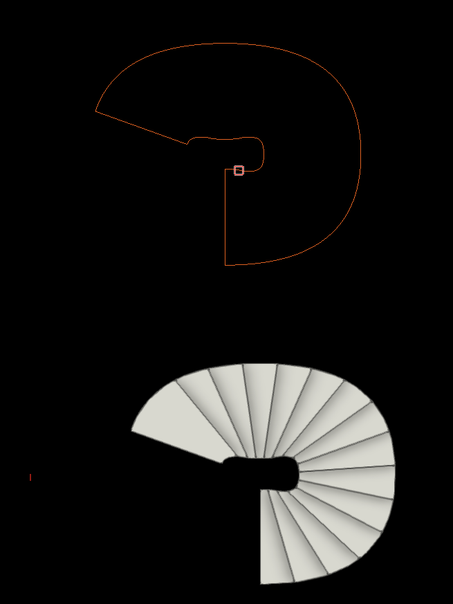 Hi First you should think about a rule which is available. Mostly this is the bigger issue than making the some code is thinking how about you think by designing and how to convert it to an algorithm. 1. The rule could be, every step line is "designed" by human (user) - Then maybe the control geometry could contain just inner and outer countur and lines which are created by user and the script would model the 3D stari 2. A logic adaptable rule as example. On the inner countur we need 15cm minimum measurement. this gives us an amount of steps we could use maximum and the vector of the step-line it through this inner minumum point and the walking line of the stair. Problem could be, that every inner distance is the same on the contour and if the countour is not symmetric the steps are not symmetric. But in your case the Stair "eye" is symmetric so this could work. Yes could work. + Symmetrical - But because the out contour and the inner contour have not the same shape as the walking line it is maybe not the best solution. + Walking line could be parallel to outer contour to make the walking path more ergonomic + Relative easy to script. repacing the center through the point which are paired to the other point. 3. The inner virtual center could be defined independent on a contour (similar to the original example but not a center just unique points but not on the contour) + This would result in nice flow of the stair because of similar shampe outer and inner center points - Different distances on the real contour. + Usefull if inner contour is not symmetric. as example Picture one - Looks line best Solution but harder to script. We need points on the outer and virtual contour (easy). Then we need sectionpoints between polyline final inner contour. This is harder. I do not know the good solution for this. Maybe through intersecting line with inner shape etc. Or have you another requirement which could be defined? If i look at your specific stair the rule is like Solution A. Individual drawn steps in 2D. I can not see a rule for calculating the inner points? Generally i think, a stair is one of the last design-peaces an architect can be creative. So maybe it is the right thing to just model individually it take too long to make an algorithm for it.