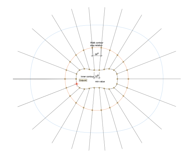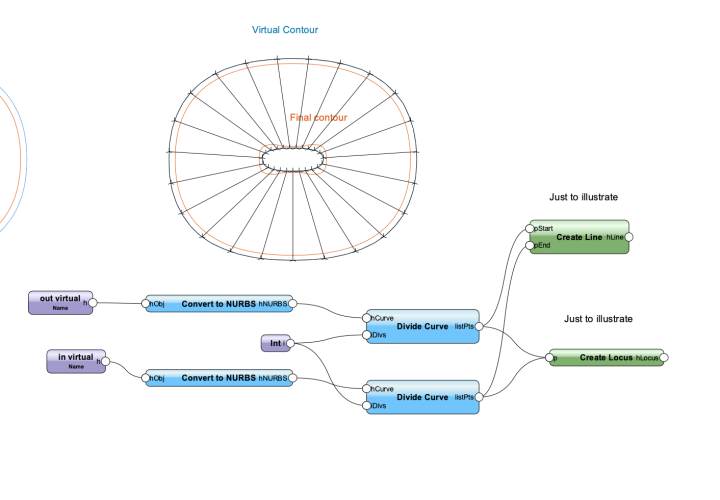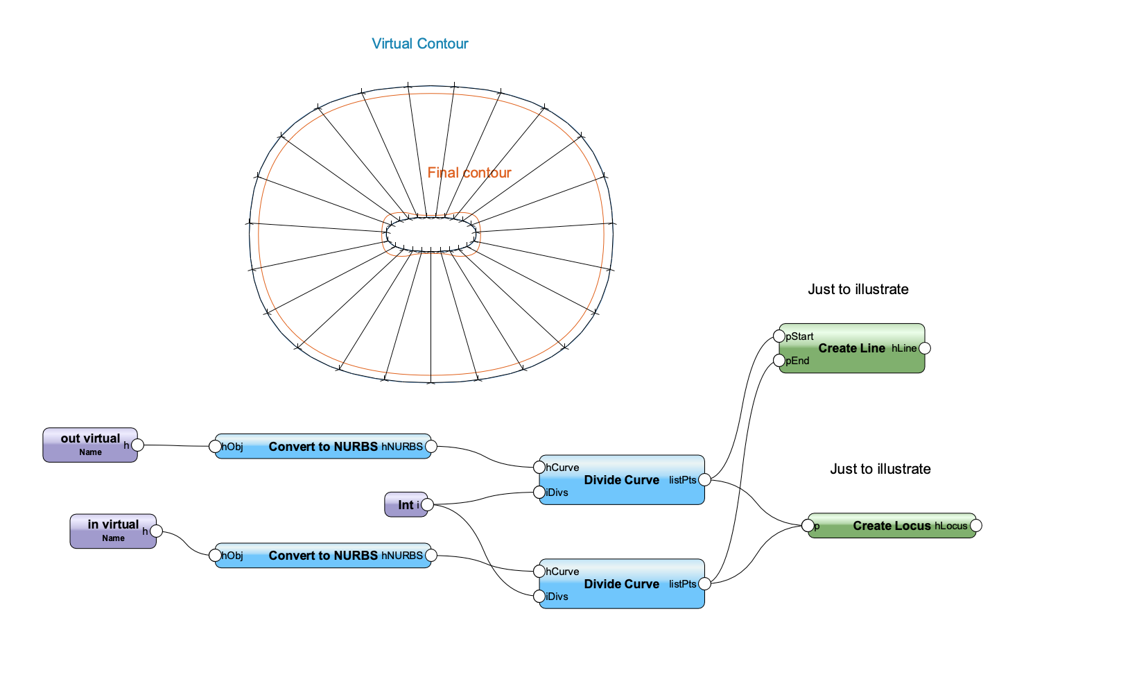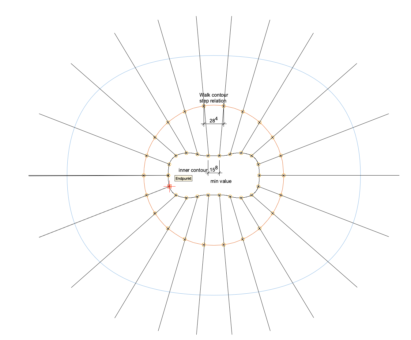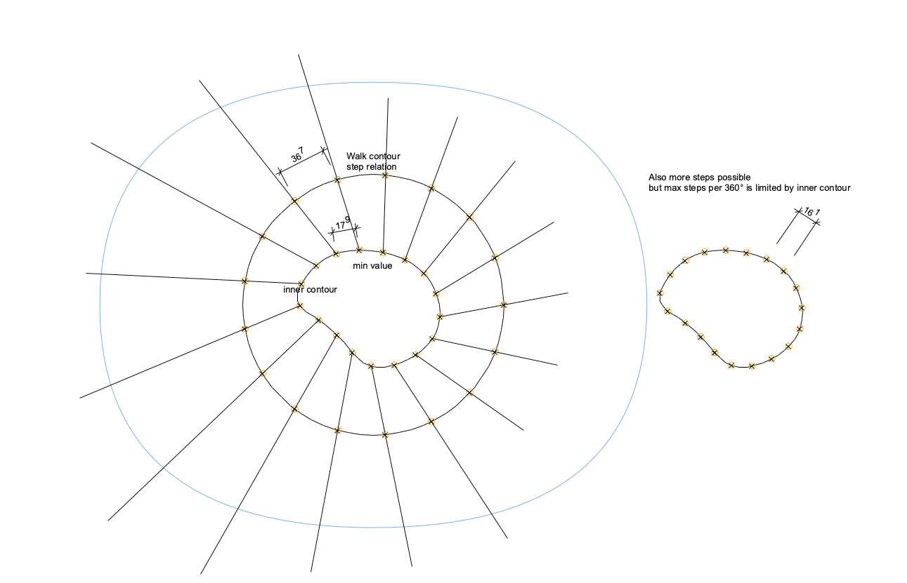 Looked a little deeper. A pragmatic solution could be, we have a virtual outer and inner contour. which have a regular shape. Then we create the points on this contours: Connecting to the existing script will modell the stair and intersect the shape: One point left, it does not stop by the final contour if it is infinite like this: To use this in a PIO you have to make control-geometry a group and order the elements in the right order: Extract them in the right order important keep order. Otherwise you will mess it up. I took order here in this example 1. VirtualShapeOut 2. VirtualShapeIn 3. Final Form. Then wrap and convert to pio You have to bound the shape ad the escape step. What is missing is the 2D Geometry, which has to many lines now. But it is makable. Not worth to go further if it is not clear if anyway the geometry methode is fitting the requirements. Connect to local Distributor ComputerWorks. They can help. If it takes longer it will be not costless. But maybe this start would help you. Oval Individual Focus points.vwx