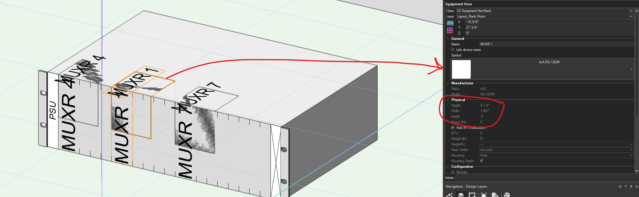 Hello- I think I may be misunderstanding something basic about how Equipment items interact with their Symbol as I've run into a few sharp edges I wasn't expecting. In this case, I have an openGear module frame. I've created a Rack Frame in my Layout. I've created an OG card as a Device with physical dimensions, but set to Modular, 2-Slots. What I see is that when I insert this device into the rack frame it correctly shows update dimensions in the OIP from the rack frame... however I see that the 3d representation continues to use the 3d Symbol with random dimensions when I first created the device. Am I missing part of this workflow? How can I make sure that the 3d representation uses the OIP dims and not the symbol dims?