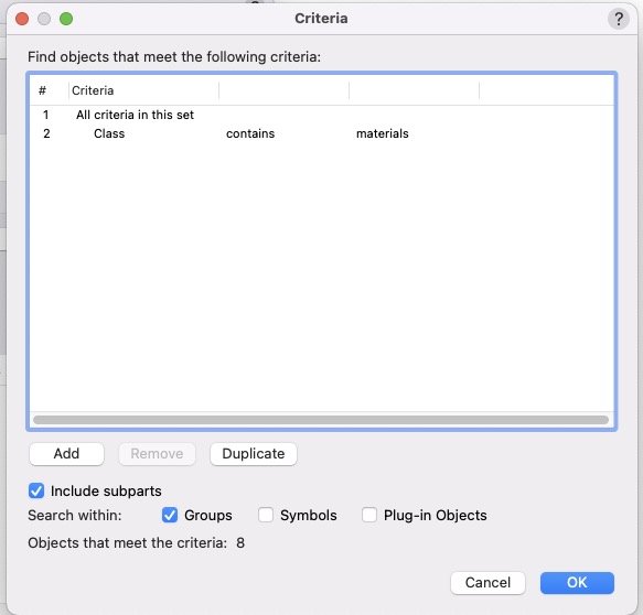Hi @Nikolay Zhelyazkov I don't think I understand what you mean here. The help page tells me this: In the example file I gave, the parent objects do not match the criteria. Therefore if the info in the help page is correct, no subparts should be captured. You refer to your case of (b) which you describe as: But in my example datavis I am not including any criteria about subparts - there is only one criteria which is simply "class contains materials": I'd like to clarify this before submitting a bug report, to make sure I'm not misunderstanding something.