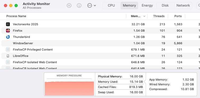 Ok, here is a test file, size 1.33GB: https://www.dropbox.com/scl/fi/klh3f3xjizwdtdhb58aso/memory-leak-test-v2025.vwx?rlkey=yamq44kh8ucs30faskzvwfw4v&dl=0 I am on a mac (Sequoia 15.4) and am observing memory usage via "Activity Monitor". This is the number I am recording and this is what it looks like when I first open Vectorworks 2025 (no file opened): 1. Open Vectorworks 2025 - for me VW2025 memory usage starts out at about 3.14GB 2. Open the file "memory leak test v2025". It should open on a sheet layer with 9 viewports. - for me memory usage goes up from 3.14 to 9.13GB 3. Select all 9 viewports and update, and watch memory usage while the update process is happening - for me memory usage goes up and down quite a bit, peaking at about 27GB 4. Once the updates have completed let things settle for a little while, until memory usage is no longer fluctuating. I give it a few minutes to be sure. - for me memory usage is now at 16.27GB 5. Repeat step 3. - for me memory usage peaks around 27GB again 6. Repeat step 4. - for me memory usage settles at around 17.62GB this time 7. Repeat steps 3 & 4 again. - for me memory usage settles at around 18.17GB this time 8. Repeat steps 3 & 4 one more time. - for me memory usage settles at around 19.35GB this time 9. Close the file (and close the "untitled 1" file that opens automatically, so we now have no files open at all) - for me memory usage now drops to 7.5GB. 10. Open the test file again - for me memory usage now rises to 12.97GB 11. Close the test file again - for me memory usage now drops back to 7.69GB 12. Open the test file again - for me memory usage rises to 13.10GB Observations - Opening a 1.33GB file in VW causes it to use an additional 6GB of memory. No idea if this is reaonable - therefore I'm happy to accept this as "it is what it is". - Updating 9 viewports (with no changes made to anything on design or sheet layer) causes it to use an additional 7GB. That feels like a lot to me. - Updating those viewports again (again with no changes made) seems to add a further ~1GB and this seems to be cumulative; every time I do an update another 1GB or so gets added on. This is what seems most problematic to me. Obviously in the course of working on any "real" file, viewports get updated over and over again. If on each cycle more memory gets taken up then of course eventually there's going to be a problem. And 9 viewports is hardly an extreme number; most files will have many more than this. - Completely closing the file leaves VW using twice as much memory as it did before I opened that file. This suggests to me that at this stage memory that should be getting released isn't. This is potentially something that's gong to cause problems when people are opening and closing multiple files in a session. It's not clear to what extent this is also "cumulative". Closing & reopening the file a few times does show memory creeping up a little but by a relatively small amount. This in any case is not going to help. I'd be interested to see what happens if others try and replicate the steps I've described, on other hardware setups.