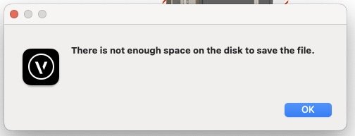 There is something that happens when memory gets full with what Apple calls "purgeable" data. As I understand it, that data is supposed to be using memory until something really needs it for something else, at which point it should be given up. My observation is that when VW tells me there's no disk space, there is usually a large amount of "purgeable" space there but for some reason VW does not access it. I actually filed a bug about this a little while ago but the response was that if it wasn't being given up, then that's down to MacOS and not something VW can change. However, I don't see the same behaviour with other apps with big file sizes, in the same situation.