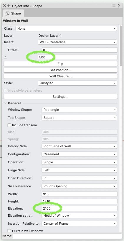 When you say "elevation in wall" which setting do you mean exactly? Do you mean the setting simply labelled as "elevation" here: A window in wall has these two settings that affect its elevation "Z" and "Elevation". What these mean is a constant source of confusion for me. Basically (as far as I understand) the overall elevation of the window is the sum of these two values, and neither is necessarily relative to the elevation of the wall. If I start with a window Z value of 0 (and elevation on 2100), and then move the wall (with window in it - behaviour of windows is to move along with the wall) upwards by 1000, then 1000 gets added onto the window's Z value. The 2100 still matches the window's height relative to the bottom of the wall but it's not actually anchored there - because that Z value is not relative to the bottom of the wall, it's relative to the layer elevation. If I next change the window Z value to 500 the window moves downwards by 500, and the window "elevation" remains at 2100. These two numbers are not individually telling me anything very useful: the main things that are useful to know are: (a) the window's height relative to the layer plane. This is now 2600 ("Z" plus "elevation") (b) the window's height relative to the bottom of the wall. This is now 1600 ("elevation" minus "Z") The two values I'm interested in are 2600 and 1600 but to get to them I have to do mental arithmetic using the values the OIP gives me. I think we should be able to input/view those two useful values instead of the ambiguously labelled ones we are given. Also door and window elevations really ought to be able to be anchored to storey levels. It seems a massive omission that the two most common architectural elements can't use storey levels. They can't even be attached to storey levels via the host wall object, because even though the bottom of a wall can be set relative to a storey level... the elevation of a window can't be set relative to the bottom of a wall!