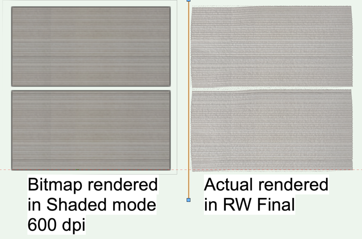 1. I tried to make a RW texture for a tile with striations.  In the attached image, the left side is 2 tiles, each 24x12, rendered in 'shaded" mode.  The right side has copies of the same exact tiles, but rendered in Renderworks Final mode.  As you can see, the RW final mode makes the edges of the tiles appear 'wavy'.    Why ?    How do I fix this ?