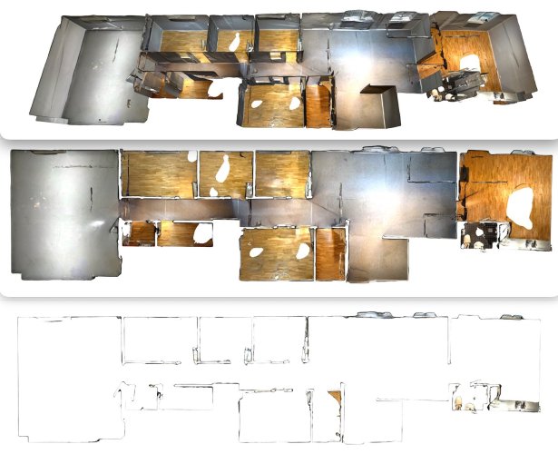 Have you tried exporting as OBJ instead ? Based on my experience, it seems to work best when communicating with various apps. I only use point clouds when the purpose of the scan is for use on terrain models. I don't know if Nomad supports export as OBJ but I guess it does. I use the free Scaniverse app with my iPhone. As always, use a gimble video stabilizer when scanning as it improves the quality and accuracy of the scan a lot by smoothing the phone motions when scanning. Here is an example being just under 30 meters wide and 181 square meters. I have compared it with drawings drawn based on traditional laser measuring, and the results were surprisingly similar. I actually spotted two small mistakes in the manual measuring. The mid picture shows the plans as it came out. My only objection is a slight angle drift on the right side. The rest was more or less spot on. You can't expect mm precession of course, but it is very helpful indeed. The scan was done in a single session that took 18 minutes. The last picture shows a technique I use for extracting more precise lines. I simply use the clip cube and select an area in the middle. Why? Because these scans tend to have a problem with dramatic changes in direction (e.g. floor to wall). It tends to look like a worn piece of soap. In the middle of the walls, you get less of such problems.