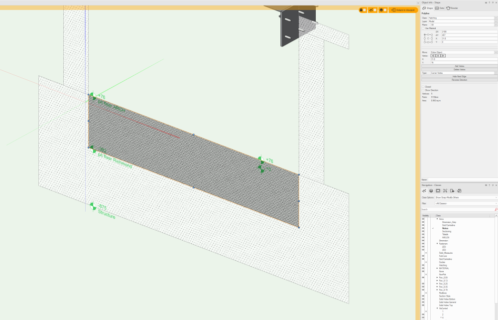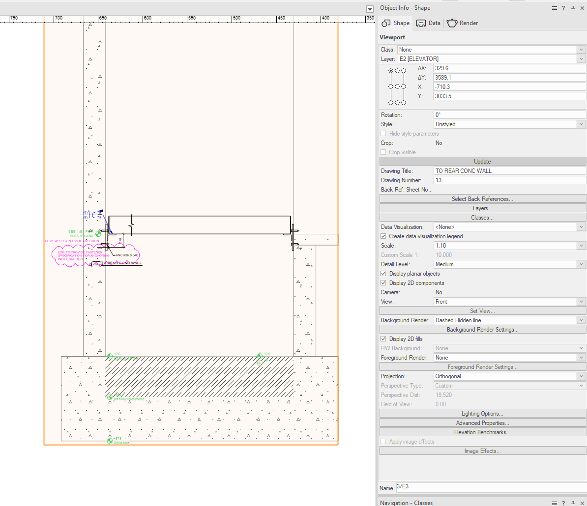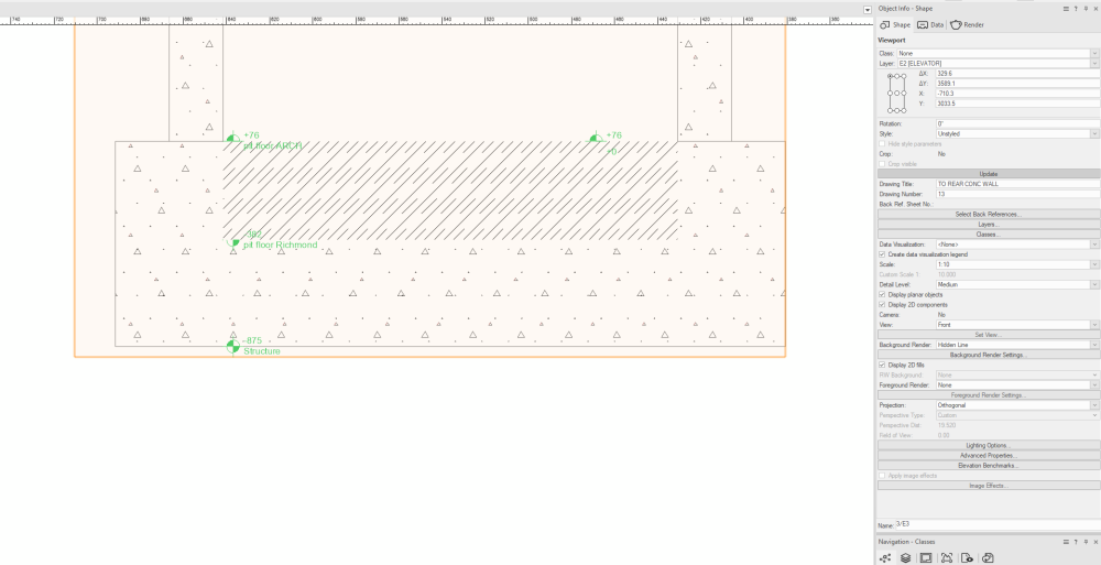 I have a bit more time today so I have spent some time diving more into the drawing. These are the things that I found so far: On VW2026 on my Windows 11 machine, I could not successfully get a Dashed Hidden Line viewport to render with 3/E2, but I could get a standard Hidden Line no problem and pretty quickly. If I turned off the MATERIAL - CONCRETE class, it would take about 30 seconds but I could get a the viewport to complete the update. If I did a class override on the MATERIAL - CONCRETE hatch to a more simple hatch (I used the Cast Iron HF hatch), it would successfully complete. If I left the MATERIAL - CONCRETE class as original and turned off the Hatching class, the update would complete after 20 seconds or so. With these observations, I opened up the Model design layer by double-clicking the problematic Viewport and selected the Design Layer option. This opens the Design Layer with the same class visibilities that the Viewport is using. I think I have found your issue. You have two overlapping Polyline objects in 3D space, each with a hatch. One is in the MATERIAL - CONCRETE class, the other in the Hatching class. Because these are both occupying the same 3D space, it leads to something called "Z Fighting", where two objects are occupying the exact same planar space and VW can't tell which to render. It looks like this in Shaded view: When rendering in Hidden Line, VW seems to have little trouble with the overlap, letting the Hatching object win: But with Dashed Hidden Line, it tries to render them both, which is causing the hang. Here are the solutions: Turn off the Hatching class in the Viewport if it is always going to be cropped out. Delete the polyline object in the Hatching class if it is not needed. Use Modify -> Clip Surface to "clip" the Hatching polyline from the MATERIAL - CONCRETE polyline. Select the Hatching polyline, the run Modify -> Send -> Send to Front Select both polylines Run Modify -> Clip Surface In 3D space, move the Hatching polyline out from the MATERIAL - CONCRETE polyline by 0.1mm so that they are no longer occupying the same space. This allows both polylines to exist and the Viewport to update in Dashed Hidden Line: After moving the polylines away from each other, I was able to update all Viewports on the sheet. It took a little time (around 20 seconds for each Detail Viewport), but I think this has been your issue. If you run into any other Viewports that fail to update, be on the lookout for overlapping polylines. 9210 Constance House Sheet E2.pdf -