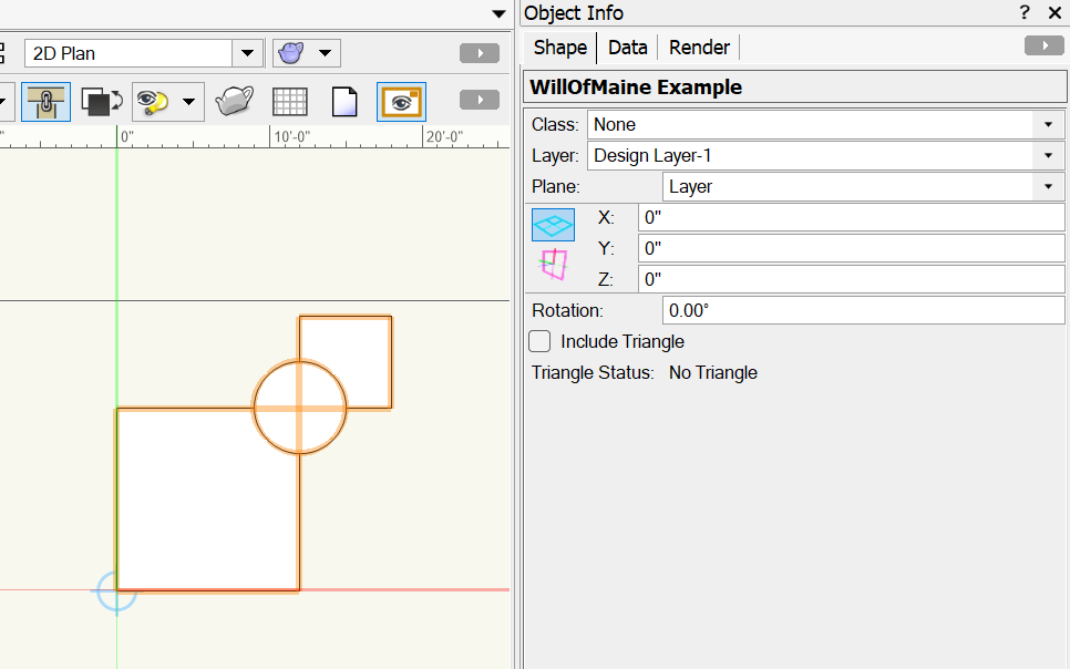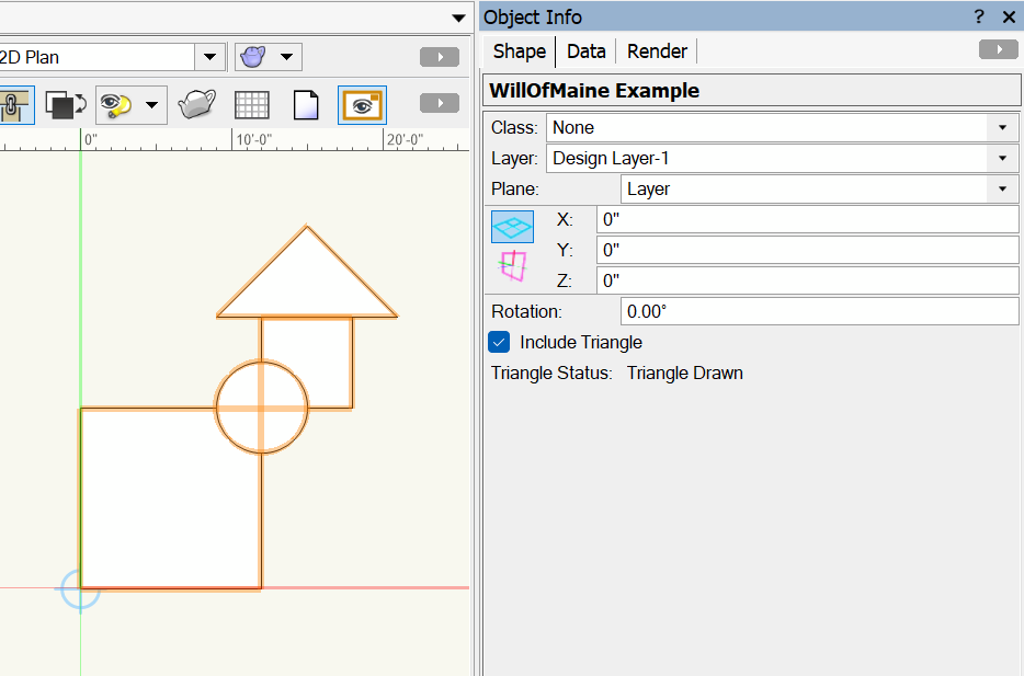 Handles are the thing that I struggled with most when learning Vectorscript, but once it clicked, they got to be pretty straightforward. Handles are basically memory pointers that represent different elements of your drawing. Every piece of geometry, layer, class, symbol, PIO, everything, has a handle associated with it. This handle is what Vectorscript uses to determine what to manipulate. If you want to use SetFillBack to change the color of an object, you will need the handle of that object. Most of the time, you can use the GetObject function if the object is named (such as a symbol definition, class, drawing resource, or named object). Layers are the only thing that exists outside of the "shared namespace", which is why you can't have a class called "Door" while also having a symbol definition named "Door". In a more practical sense for what you are looking for, let's say you wanted to set the color of the triangle that your script creates. You would use the SetFillBack procedure to do so. To get the handle to your triangle, you could use the LNewObj function immediately after creating the triangle. You wouldn't even necessarily need to assign it to a variable, you could use LNewObj in the SetFillBack procedure directly, as in SetFillBack(LNewObj,0,0,0);. You would only need to assign it to a variable if you needed access to the object later in the code after creating something else, where it would no longer be the last new object. I'm sorry if I muddied the water with the "read-only" information regarding PIO parameters. For the script you posted above, it doesn't really apply. You can likely ignore the next couple of paragraphs and be perfectly fine (for now), but if you want to learn a bit more, read on. Let's say that changing a different parameter would necessitate forcing the includeTriangle parameter to false, you couldn't say PincludeTriangle:=FALSE;. I mean, you could, but nothing would happen. You would instead need to do something like SetRField(<handle to PIO>,<name of PIO>,'includeTriangle','False'); In this case, you would need a handle to the PIO itself. This is where the GetCustomObjectInfo function come in. You would need a string variable for the PIO name (such as "objName"), then three handle variables for the PIO handle (such as "hObj" or "objHd"), the parametric record of the PIO (such as "hRec" or "recHd"), and a handle to the wall the PIO is embedded in (regardless of whether it is embedded in a wall, I usually use "wallHd"). This is also a FUNCTION looking to return a boolean as to whether the resulting object and record handles actually exist, so you might need an extra boolean variable (traditionally this would be something like "result"). For the sake of example, let's say you had another variable that wanted to report on whether or not includeTriangle was checked. We'll make it a static text parameter called "triStatus", defaulting to "No Triangle" and changing to "Triangle Drawn" when includeTriangle is checked. The code would look something like this: PROCEDURE RandomGeometry; VAR includeTriangle, result:BOOLEAN; objName:STRING; objHd,recHd,wallHd:HANDLE; BEGIN includeTriangle:=PincludeTriangle; result:=GetCustomObjectInfo(objName,objHd,recHd,wallHd); IF(includeTriangle) THEN SetRField(objHd,objName,'triStatus','Triangle Drawn') ELSE SetRField(objHd,objName,'triStatus','No Triangle'); Rect(0,0,144,144); Rect(144,144+72,144+72,144); ArcByCenter(144,144,36,0,360); If IncludeTriangle THEN Poly(144-36,144+72,144+72+36,144+72,144+36,2*144,144-36,144+72);{Triangle} END; Run(RandomGeometry);