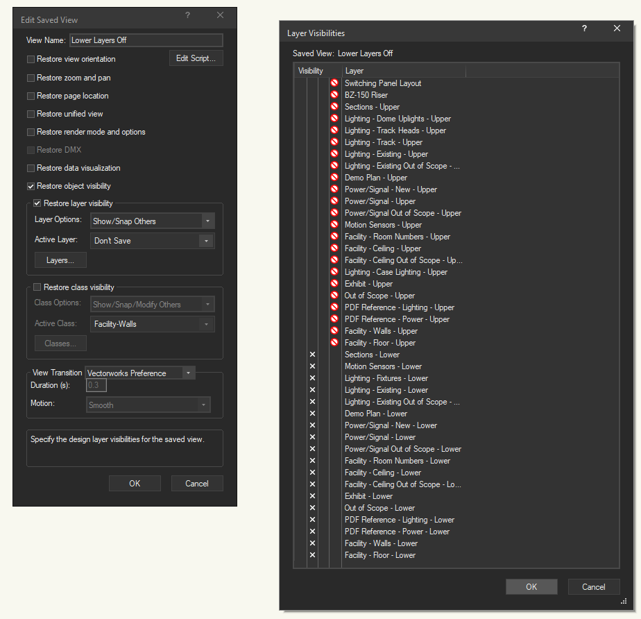 Unless I'm misunderstanding the wish, this is something Saved Views can already do, and is pretty much the only thing I use Saved Views for. Most of my Saved Views look something like this, with all view options unchecked, Active Layer set to Don't Save, and a group of Layers set to be visible or hidden and the rest set to ignore. You can't really make one Saved View as a toggle, so you instead need one for visible and one for hidden, but I find it to be pretty convenient. I usually only do Layers, with the way I use Classes I don't have to futz around too much with visibility, just setting visual overrides per Viewport. -