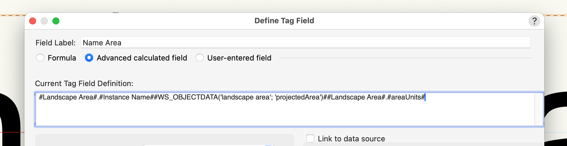 Ok, thank you! EDIT: @Alexandra Beshevlieva When I change the parameters per your instructions it simply removes the name and projected area altogether. What am I missing? Typically I use the "Define Tag Field..." dialog via "Edit Object Style..."→"Edit Tag Layout" and the accompanying drop-down options. In this case I copy-pasted your parameters into the field definition box.