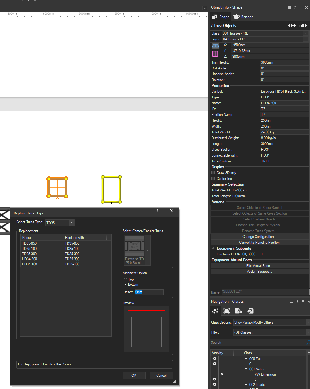 Hi I post this here, I remember that @Scott C. Parker asked examples of changing truss process. This is very typical case I go thru. And this time I'm doing this as I write this to get authentic screenshots. Stick of trusses in the drawing, this time 9 x FD34 3m. For warehouse inventory reasons this needs to be changed to different truss and configuration. OK, we have tools for that, lets get on it. Replace Truss Type... I get pretty long list of candidates to chance to. Odd is that I'm pretty certain that in this file we have never used most of truss types that are in offer. Yes I have sometimes my self used this type of trusses in this installation of Vectorworks. Doesn't matter, I choose what I need, HD34 it is. All well, I have HD34 on drawing, somehow it is also desired silver type of symbol. That symbol or any other distinguishing info was not shown in previous dialog. But dang, now I still need to change configuration because of warehouse inventory. I need to use 6 x 3m and 4 x 2m. Its 1m short of original length but that is OK in this occasion. Choose truss, click Change Configuration button from OIP. You are greeted with this UI of usability. So many lengths to choose from. And ample space to use in actual business end of things. Now it is easy to choose right lengths for my need. If only I could know what length of truss is what symbol. Easy, lets be brave and take a pick from three different 3m piece that is on offer and then pick one of 2m pieces. Calculation is correct that after selection we are 1m shorter than original. Still bravely we advance. And this is result, black 3m pieces and Invalid Truss Symbol for 2m pieces. Well, 🤔, I was aiming for silver truss. Something is clearly wrong, lets try to fix 2m issue first. I had other option for 2m truss lets try that. Better but not quite right. Now I must reason that I don't have correct symbol in my file for 2m silver HD34. Lets add that to drawing by importing it to Resource Manager so it is in the file. But NO I still have only two options for 2m truss. What on earth is going on. Why I don't have that just imported symbol to choose from? Now I just need to know that it is needed to place one instance of truss to design layer for it to register as an option in truss configuration. What in earth??? And last step is to raffle in Replace Truss Configuration dialog what truss is what symbol. Usually coupe tries is enough. I cant prove it, but I also have hunch that in Replace Truss Configuration dialog trusses are chancing order in that length group depending what is chosen. You can't just pick "next in line" after each try because order has changed. Would it be idea to be able to choose right symbols to use in Replace Type dialog Not just truss system? A bit same way as you can choose corners in that same window? What is left to do is configuration changes, but maybe we could use this same process to do that also. I think that would be more intuitive way. I understand that Change Configuration process uses features of inventory somehow but I have not needed those in my years of use. Maybe someone uses truss inventory. We have inventory in different program that does that better and knows inventory by gig. This might also relieve pain about changing truss between inch/feet and metric systems. Now I think that easiest is to draw similar length line from other system and replace old with new. At least in Replace Truss Configuration show truss symbol name with length. That way user can read what is what. O, I almost forgot. when using these tools data from original trusses is lost. I mean class and Position Name of original truss. Losing Class info I almost can understand but losing Position Name is unforgivable. Must be way to read and save data from original system and write it to new system. I know that there is variables in here also but, 98% of times all trusses in same system has same Position Name and class. There is quite many step involved in chancing truss to match what is going to be build. I see why it feels easier just draw new system and delete old one. And this was just stick of truss. Don't get me started with complex structures... I hope we can get smoother process to change trusses.