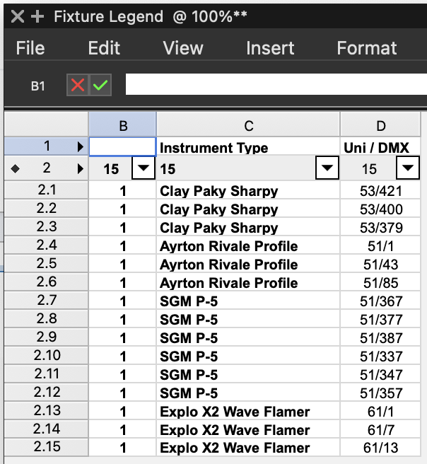 Sorry, I didn't see this message before. But I'll add a simpler project here later to see if we can make the Worksheet I need. Still, right now I have a problem that I would like to solve Lista de Fixture types: This formula gives me the list of all the Devices (column C) that I have in my drawing. ='Lighting Device'.'Inst Type' I want to make a table that gives me only a certain type of "Instrument Type", In other words, for example, I wish I could have a table where only the "Clay paky Sharpy" appeared. Something like: ='Lighting Device'.'Inst Type' == 'Clay Paky Sharpy' How can I make it?