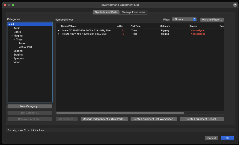 Hello everyone, I have a stage structure built with Layher scaffolding, and I need to create a report listing all the pieces required(standards, ledgers, diagonals, decks, etc.). My first thought was that these objects would appear under the Rigging category so I could generate a report the same way I do with truss or hoists — but they are not included as Rigging Objects. So my questions are: 1. How can I add Layher scaffolding pieces so they appear in the Rigging tab? Is there a way to classify them as rigging items, or is this not supported? 2. Even better: how can I create a custom tab such as “Structures – Layher Pieces”? Something similar to how Vectorworks shows: Truss Hoists Rigging components …but for Layher components, so I can run reports and count pieces properly. If there is a recommended workflow (records, custom OIP, attaching a specific data set, etc.), I would really appreciate some guidance. Thanks! Cristiano