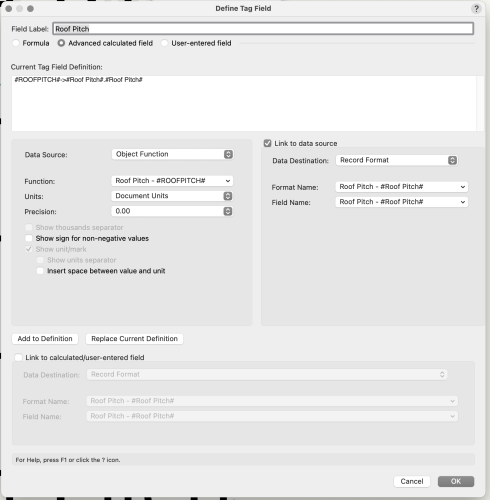 Then you have a way to do it in one case but not the other. Hopefully someone else has a bright idea. Or perhaps you just need to Ungroup all your Roofs to turn them into Roof Faces... What I don't understand is why I can't send the #ROOFPITCH# value to a field of a Record Format attached to the Roof as I can with other parameters. Because once the value was in a Record Format I could then bring it back in again + use it in a worksheet formula. Do you know @msharon...? I mean something like this: