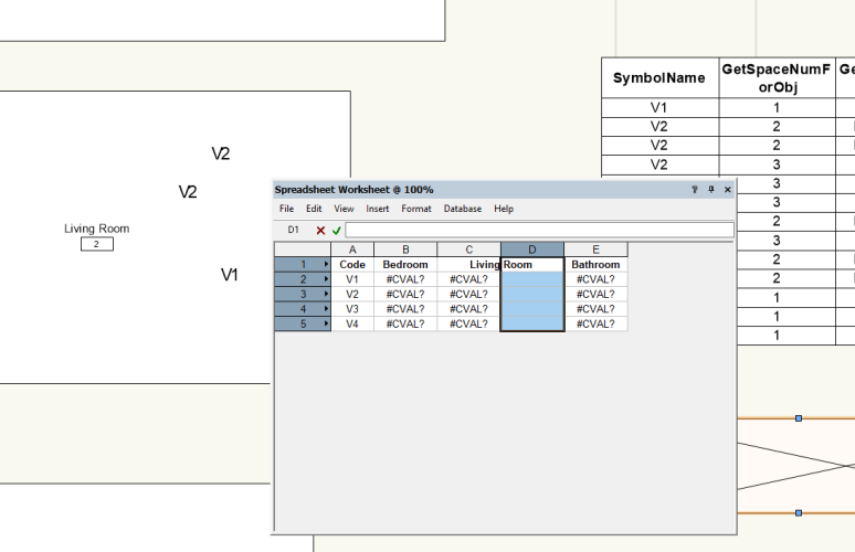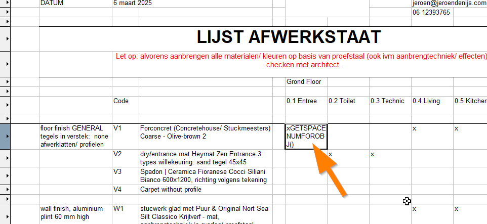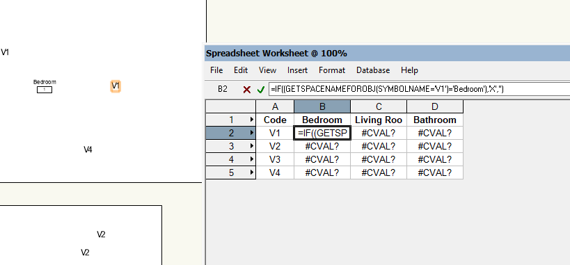 @Tom W. I just adapted your formula to the data in my document (=IF((GETSPACENUMFOROBJ(SYMBOLNAME='V1')='Entree'),'X','') and it gives no results unfortunately...