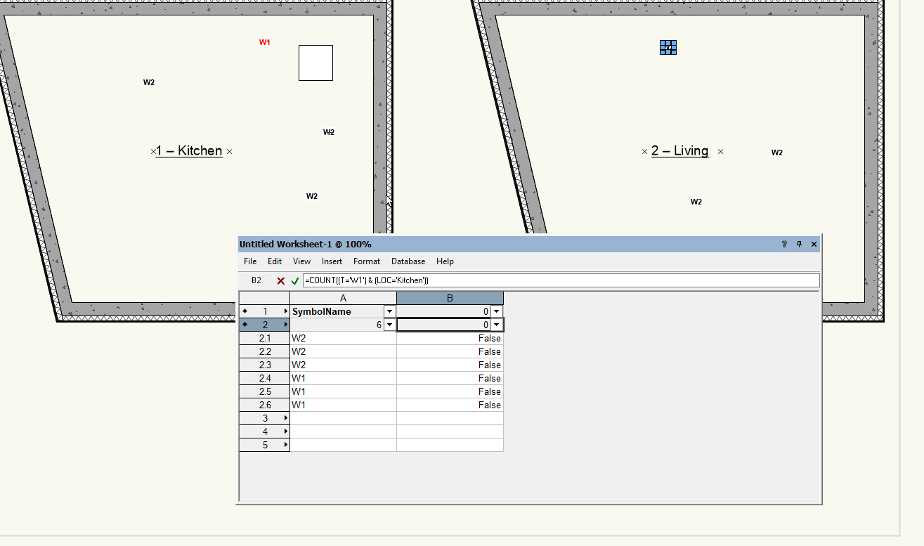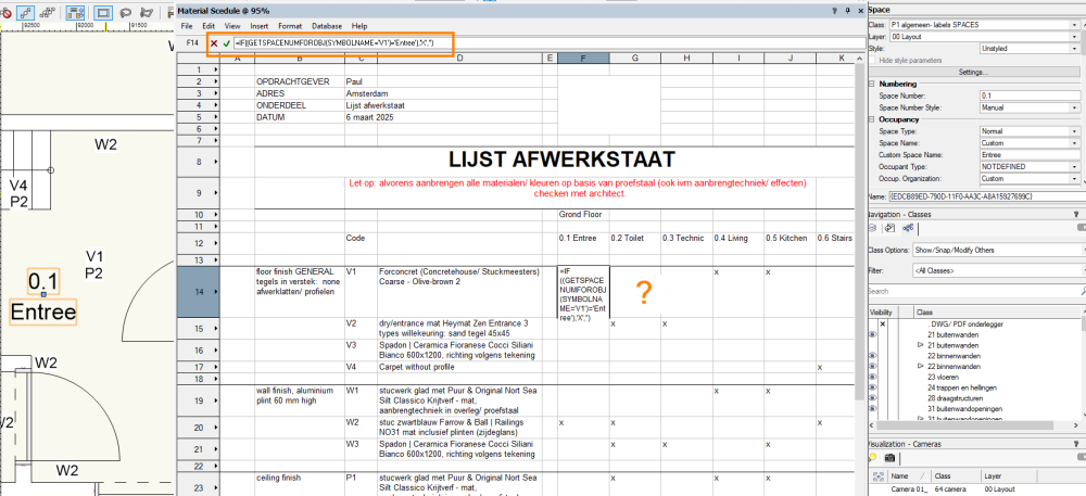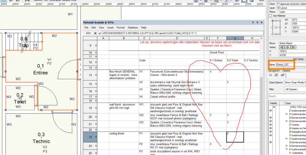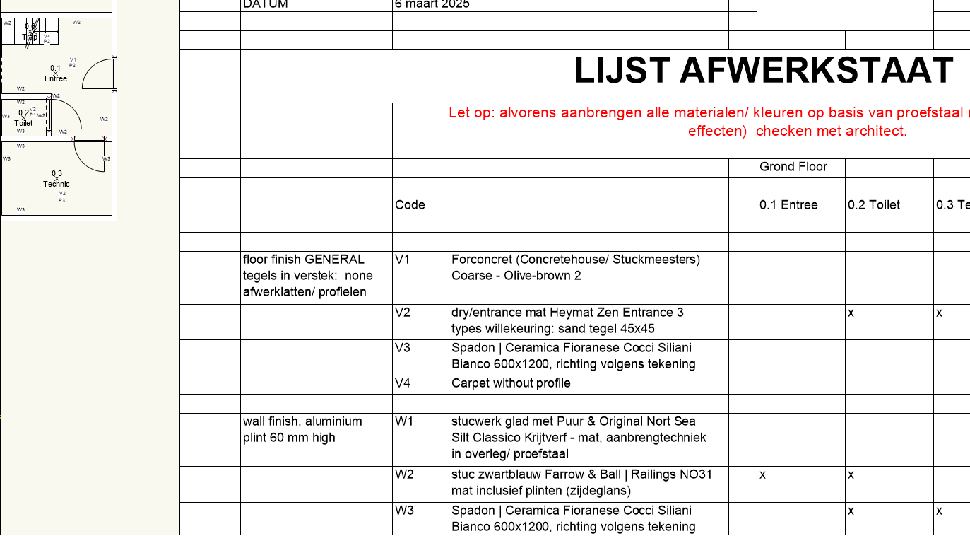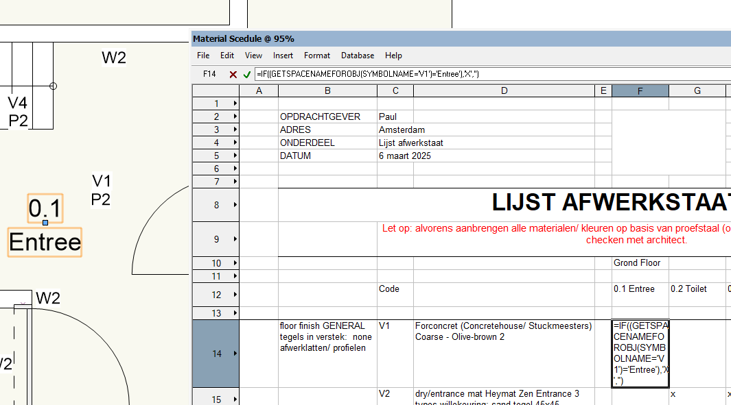 @michaelk I know I previously said to sum all the symbols, but that was only because it was the only way to make it work at the time. This is the report I want to complete. There is no need to total the symbols (or texts, if that makes it easier) — for example, “V1” — for this report. Instead, I need a mark — an “X” — for each symbol or text present in the room. For example, “V1” represents a specific floor finish, and “P1” a specific ceiling finish. This way, the contractor knows exactly which materials to apply in each room. Ideally, when a symbol or text is added or removed, the corresponding “X” in the report should update automatically. Sample file attached. afwerkstaat test VWX forum.vwx Screenshot of rooms and and the accompanying report: Screenshot of (Tom's) Simple version :