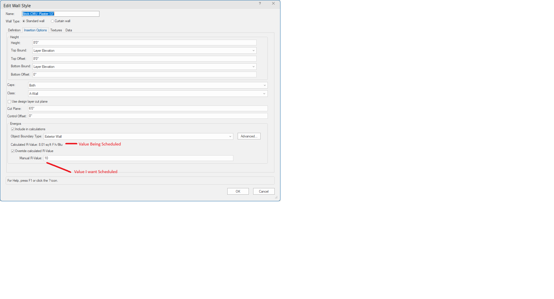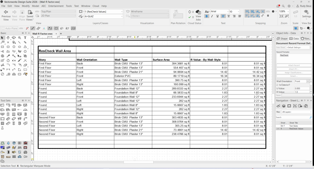 Ok that did the trick. It hadn't even occurred to me that I had to look out for that when updating the wall style. I spent hours last night trying to find a "manual override rvalue" (or something similar) to stick in my worksheet function. I know I'm going to be iterating designs in ResCheck, so in order to not have to manually recorrect each individual wall, I wanted the wall style to drive that value. Thanks, Rudy Beuc -