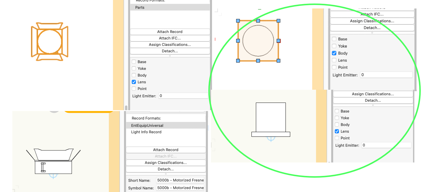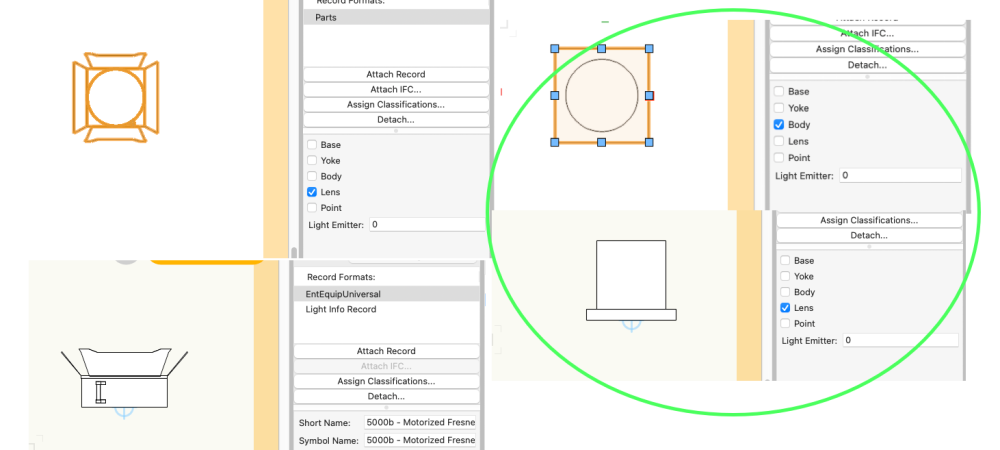Whenever I make a custom item like this, I always look at how a VW version is built. When comparing your symbol to an existing Top Hat, we see the 3D needs to be set to Body instead of Lens. The 2D needs the parts record set to Lens. Give these a try and let us know how it goes. -