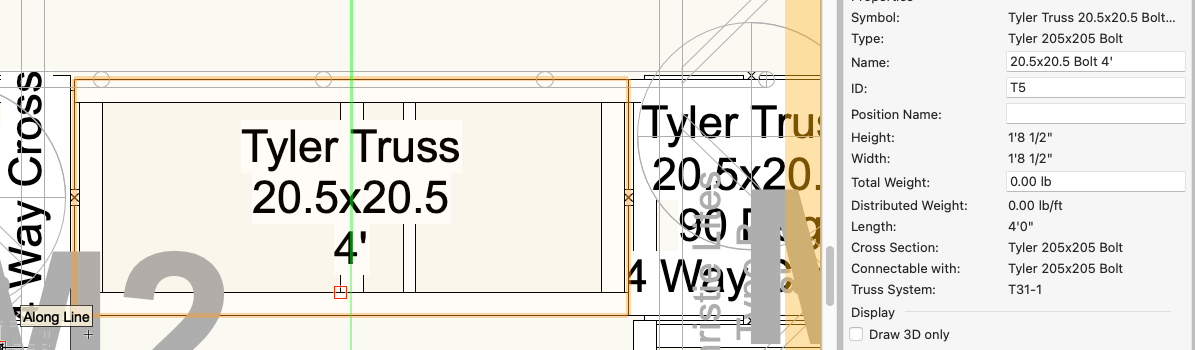 In example, I've used the concept from the stirrup hanger and built a drop T using the ASD truss pipe parts. Putting the truss symbols inside the sidearm object uses the desired parts, but requires building an actual sidearm-compatible pipe with the pipe record attached. I've also been playing with adding the Pipe Record to truss objects, but I'm not ready to offer an actual workflow. I think one of the issues with your approach is that the truss items you're using lack the pipe record needed by the sidearm tool. Issue number two, and more importantly for this, side arms attach to other pipes at angles by default. The angle is set by the chosen clamp. The tool does not allow pipe end-to-end connections. Though I've thought about building some sort of custom pipe-sleeve type object that could trick the tool. No luck so far. Here's my file to play with. truss connection SCP.vwx Since the tool is new, we're eager for feedback about the workflow. Be as detailed as possible in how new functionality and workflows would work.