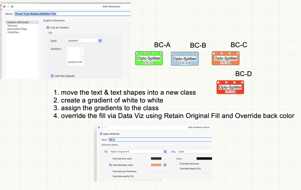 Here's a different approach, still a bit of a hack, but you can save the results for future use of the distro symbols. Here's a file to play with. Distro Data Viz Color Change MS.vwx -