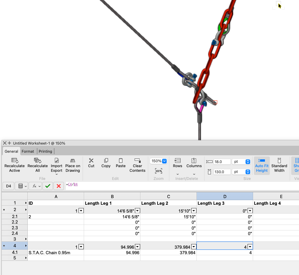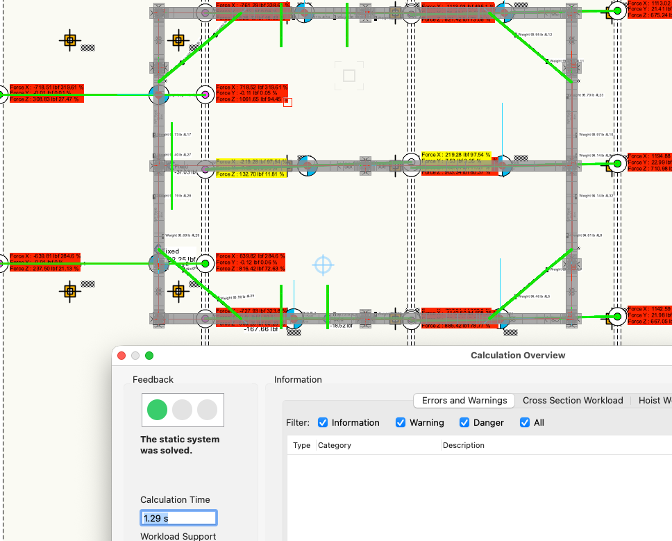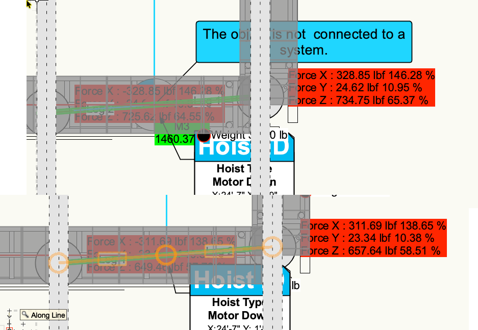 Some items just needed a little shifting to have them be seen as connected. Matthew's file was very helpful. I took it a bit further and found more items that were not connected properly. A nudge here, a shift there, a couple of re-drawn bridles, and we're able the calculate the system. It's showing a lot of red, but I don't know the load limits of your overhead beams. Bridles_BK (2).vwx