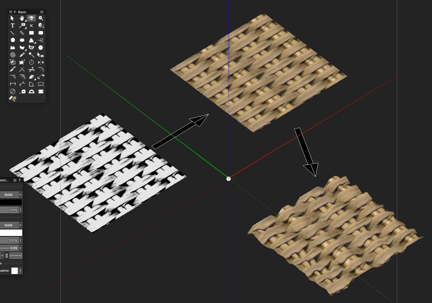 It appears displacement mapping is the theme of the day. You could build a displacement texture very quickly to suit your needs in Vectorworks. You can do it with four polygons. What is not shown here, is that you need to export two images, the image map and the bump map, then bring them back in as the texture. The short video below shows this method.