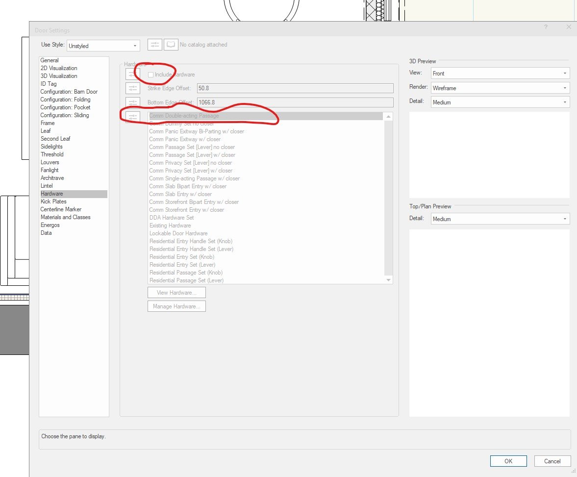 Thank you @Tom W. Reassuring to know I'm not gong mad 😉 Just tried a completely new file. Created a simple wall. Added an opening. Added the Door Schedule and it brings up that DHW# Hardware Style. For some reason it seems to be hard wired into openings, with no way of removing it. Screenshot attached. Maybe a job for the apprentice Joiner....... to fit hardware to an opening 😉 There should be an option to remove hardware from openings. Mike