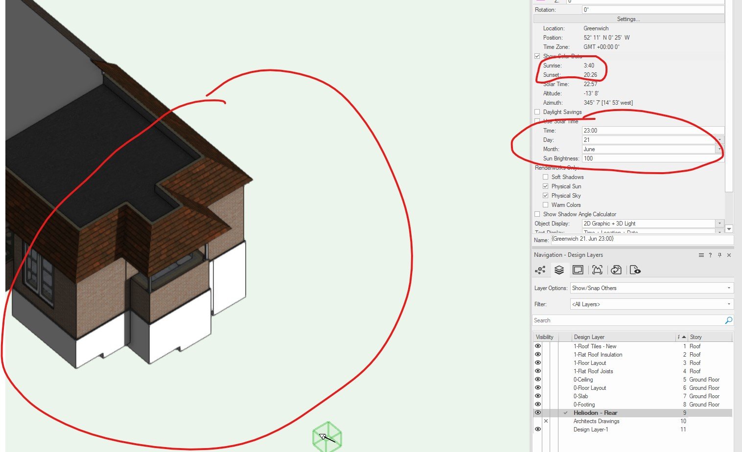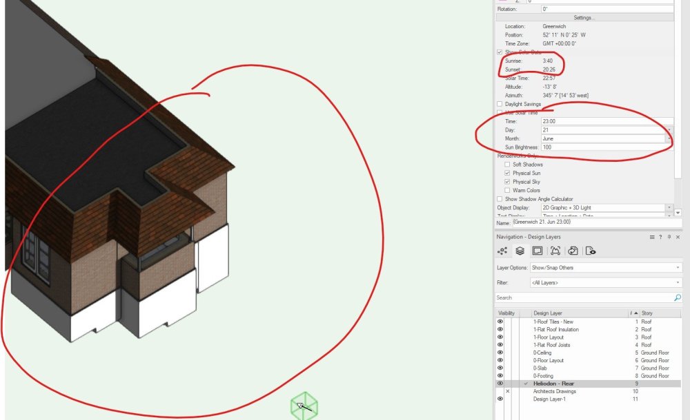 Hi I've used this before but I must have forgotten something. I've geo referenced the file/model to Bedford in the UK, but for some reason the Heliodon is showing sunlight at midnight. The Heliodon Settings have been changed to use the Geo Referenced information. Any help would be appreciated. Kind regards Mike C10-2025-03 - TH Proposed Extensions.vwx