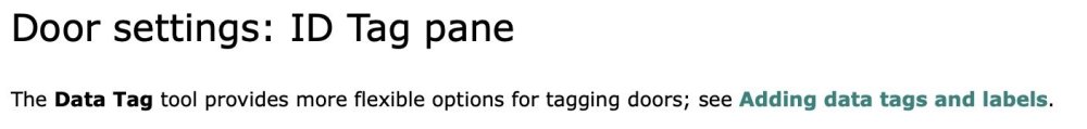 No. Data Tags read the information that is already in the objects, so you can turn off the ID Tags and display the same info with Data Tags. They also work for many other objects, so you only really have to learn to use them once. There are prebuilt Data Tags in the Resource Manager which you can use as-is or modify graphically and/or the data displayed to create your own. The biggest learning curve is if you want to customize Data Tags. The VW Help files for Door ID Tags also points in the direction of Data Tags: Here are some resources at VWU that might help: https://university.vectorworks.net/course/index.php?mycourses=0&tagfilter[category]=0&tagfilter[type]=0&tagfilter[difficulty]=0&search="data+Tag"&langfilter[]=0 https://university.vectorworks.net/course/index.php?mycourses=0&tagfilter[category]=0&tagfilter[type]=0&tagfilter[difficulty]=0&search="data+driven+documentation"&langfilter[]=0#coursestab -