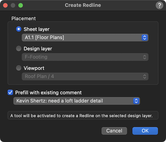 @Joe-SA Yes, as I said previously, we have limited information from Bluebeam for the graphical representation of the markup from Bluebeam Studio. We are awaiting expanded capabilites from them for that aspect to improve. The collaboration object is best thought of right now as a data proxy where you can have offline access to Bluebeam session markups and their associated comments. It contains the totality of the data and comment threads for each markup. You can translate those into new redline object entires or additions to the BCF Manager. Think of Bluebeam Connection as an internal tool for converting Bluebeam session data into actionable items within your Vectorworks workflow, not as a literal version of Bluebeam Studio inside of Vectorworks. On the redline object, you can populate it with a prefilled comment based on the content of the collaboration object. Because a collaboration object can have multiple comments associated with it, we allow the user to choose which one they would like to use. See the attached screenshot. Importing of PDFs will be enabled with the Update 4 release coming soon. There's a known bug on the first dialog box in the Update 3.1 version. From a graphical standpoint, the PDF import will offer the same level of functionality as importing directly in the Bluebeam Connection interface would give you. Your feedback is really appreciated. I definitely believe there are ways we should improve filtering of the source material for things such as author. I'll probably reach out to you via DM in the future to discuss some items. I will investigate further the errors you mentioned with ellipses and images to see if a bug report needs to be filed. (update: bug filed) Again, thanks.