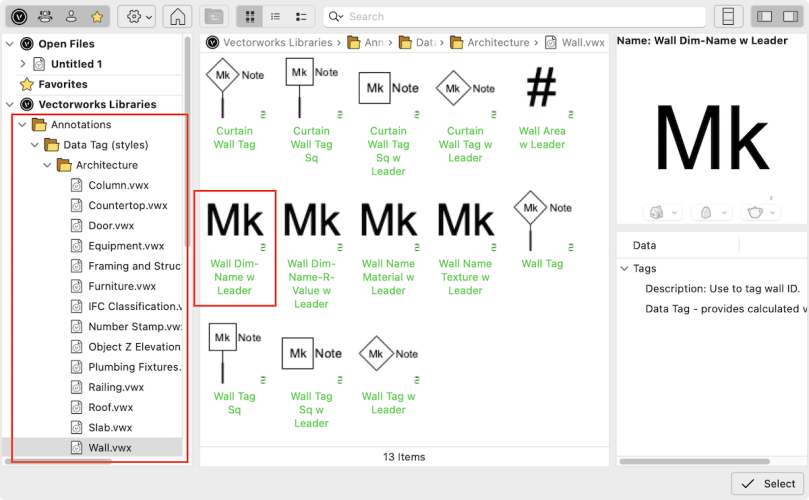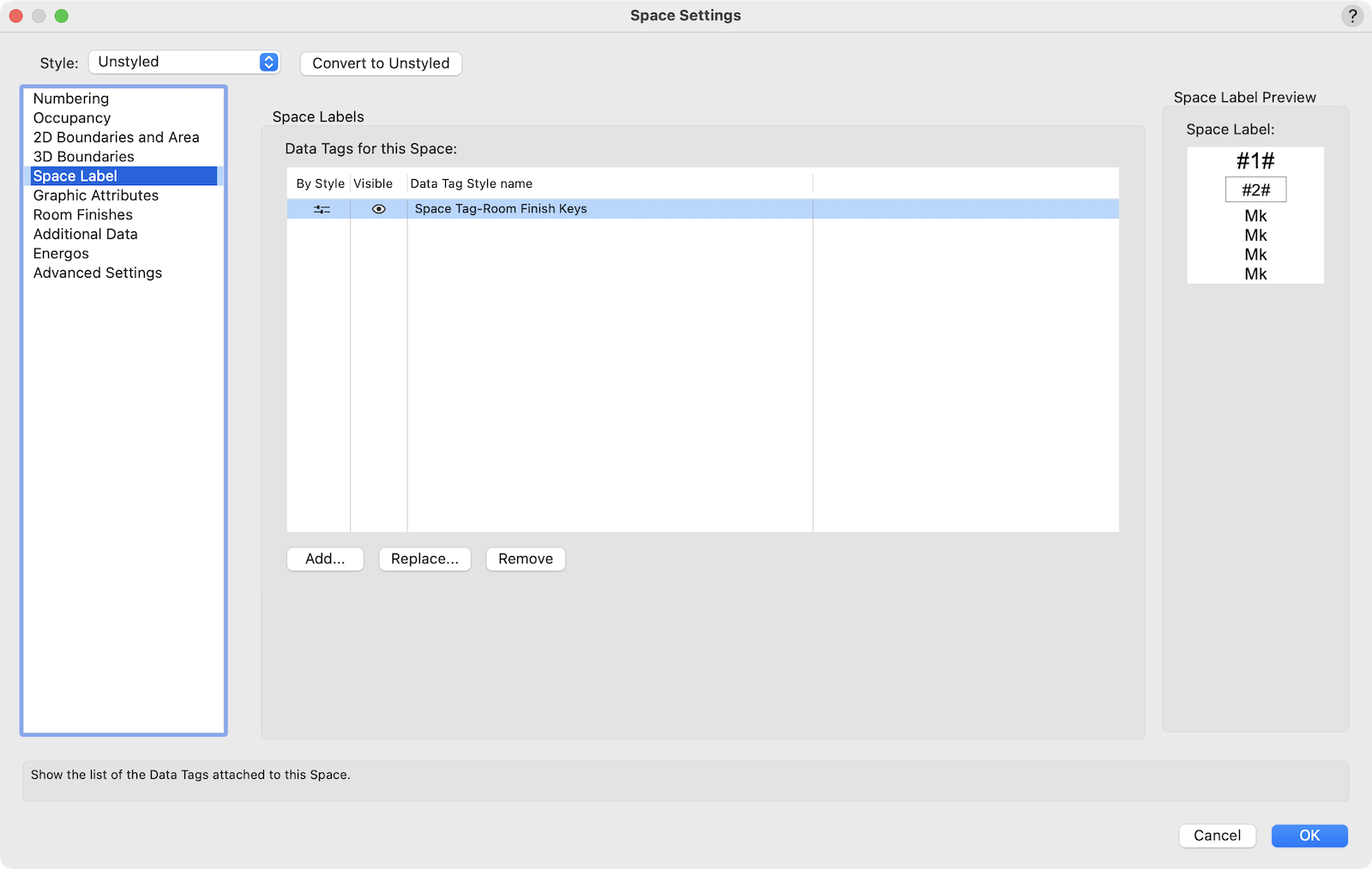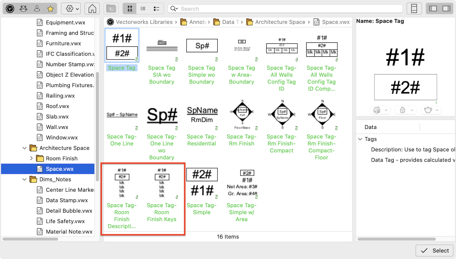 You're not going to have the space object in Spotlight, so that won't do what you're looking for. But, attached is a file with a basic tag showing the formulas you need for a correct display of what you're looking for. You can modify it as needed in the tag layout for your purposes. In Vectorworks 2025, we added the ability to use worksheet formulas directly in data tags. This is what this data tag uses to create its data: Area: =AREA Room Dims: =CONCAT(TXT(HEIGHT, 'DIM'), ' X ', TXT(WIDTH, 'DIM')) Hope this helps. tag.vwx -