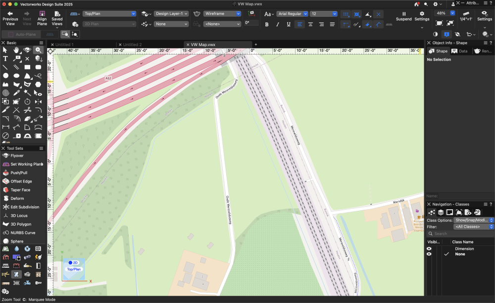 @Maurits Verbunt Follow this video. I brought a PDFstreet map into Vectorworks using this technique The video is about bringing a map into Rhino BUT IT WORKED FOR VECTORWORKS IT'S FREE The picture shows what I brought into Vectorworks The guy keeps mentioning Digimap, but he was using OPEN STREET MAP.