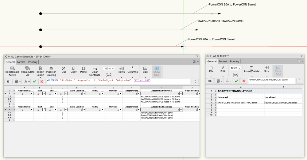 Yes. You can use the VLookup Function. You need to make a Worksheet Table of all the "Translations" that you use, and then just reference the table by adding the VLOOKUP function to the SL Cable Run Worksheet. I have named the translations Worksheet 'AT'. You can also add the formula to Data Tags. Here is your file back. Cable Adapter Local Name.vwx I have been working on a new set of Tutorials for the Vectorworks Cable Tools, which will be on the Showvector website soon after the next Vectorworks update is released. You will be able to find a tutorial about this included there. -