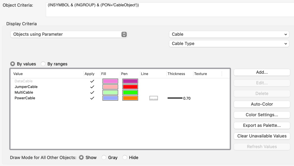 What I think you mean is actually possible using Data Visualisation. Rather than changing properties of particular object Types, you change all objects that aren’t Truss, Hoists or whatever else you want to Hide and everything other than these objects will be hidden. I coose anything that doesn’t have the EntEquipUniversal Record attached which will leave all entertainment objects visible and hide everything else. -