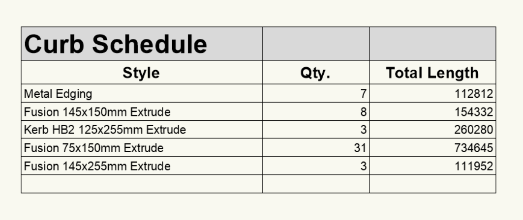 I'm pulling quantities out of a model. For Hardscapes and Landscape Areas I can use the Select Similar tool with class and object type to select all instances of any particular Hardscape/Landscape Area type and the OIP gives me a total area - handy. But for Curbs the OIP will only show me the length of a single curb instance. No combined length if I select more than one curb... Would it be useful to add this functionality as a quick way to add up curb lengths? Update - Adapting a Fence Schedule didn't take long and means I have a fast way to update quants if there are design changes -