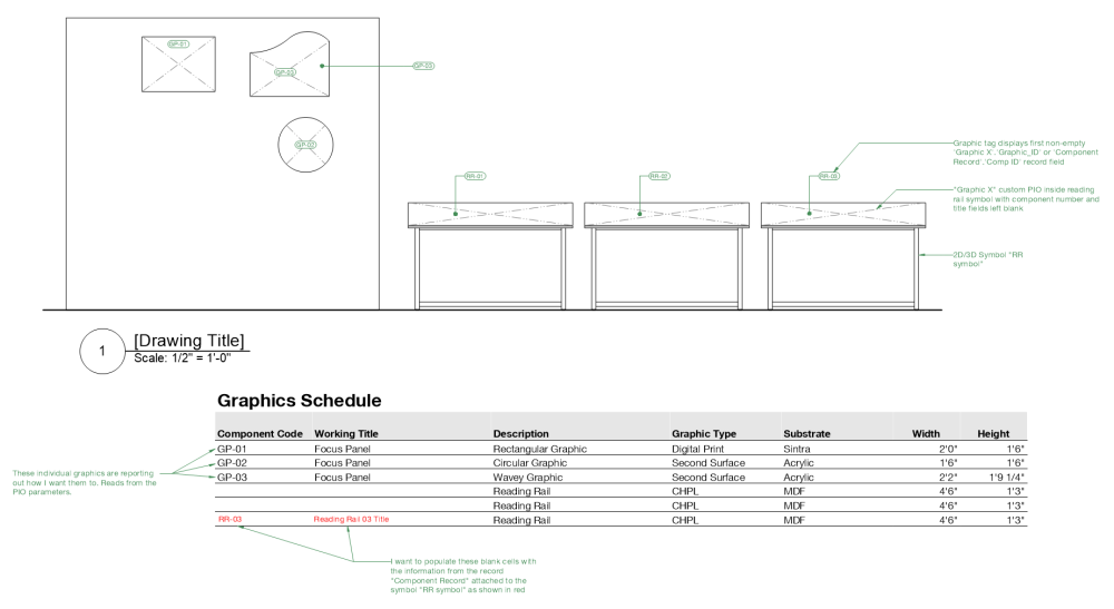 I'm trying to create a worksheet that reports all the printed graphics in an exhibition. I have a custom PIO to represent a graphic surface that includes the title, output method, dimensions, etc. Those graphics are reporting how I'd like. However, we frequently have repeating elements in a show such as object labels or stanchions. I would like to have the custom PIO as part of that symbol, but still be able to give each its own code and title. I've done that with my data tags by attaching an additional record to each symbol, but I'm having trouble figuring out a way to report it on the schedule. I tried having the "Component Code" and "Working Title" columns populated via script, but can't get the correct handle of the symbol instance with the record attached (every symbol instance shares the same handle). I could have the PIO simply grouped with the stanchion symbol, but then I'd need to manually adjust each one if the size or output method changes. Hopefully the screenshot below and attached .vwx explains what I'm trying to get at. Any thoughts on the worksheet, or suggestions on a different approach? Thanks! graphic test v2025.vwx
