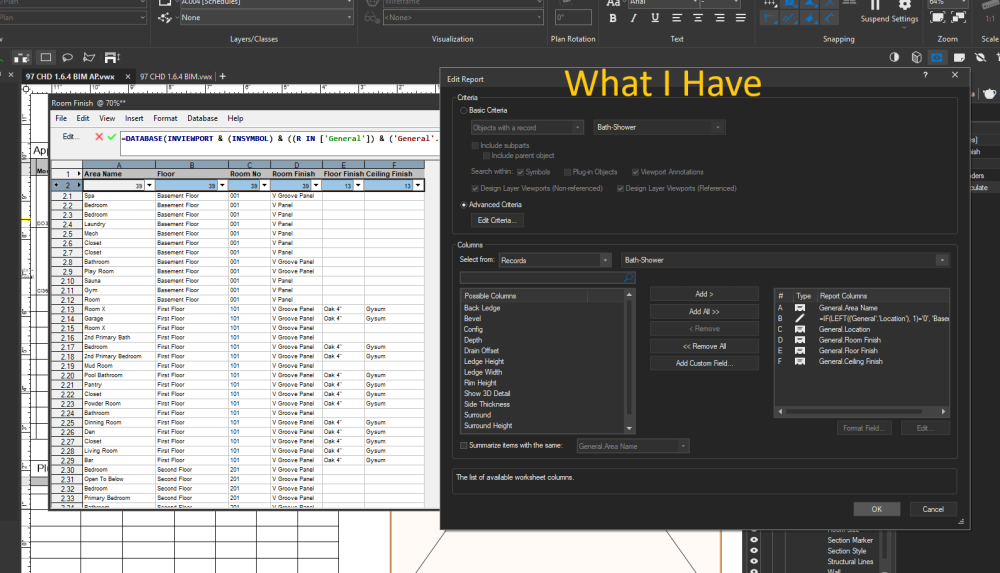 Hi, I am looking for some help creating a set of workable and and easy to use worksheets. We have used them in the past with mixed results. I would like something easy to use and edit that can produce symbol schedules (done this with mixed results), measures floor areas by class, door schedules, wall finish schedules by area - tiles/wallpaper/paint etc I am not looking for tutorial on what VWX can do. I want it set up to my brief and then taught how to use it. Can anyone help or point me in the roght direction? Regards Mark