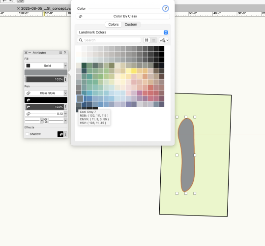 I have a working drawing that is not displaying the correct colors selected using the Landmark palette. I am not getting this behavior when I open a blank drawing, but able to reproduce by copying the existing drawing. In a blank drawing, the selected swatch is highlighted for a selcted object on the palette, not so in the problem drawing. I'm not sure if this is a great metric but translation between the color meter on my machine and the stated RGB values on each swatch do not agree. Screen shots, recordings, reprex attached. PWF Screen Recording 2026-01-05 at 11.16.43.mov 2026-01-05_forumReprex_palette.vwx