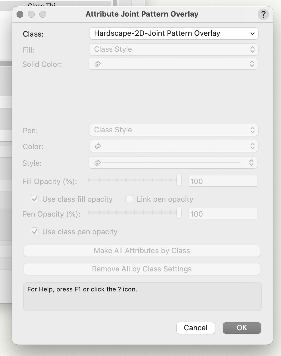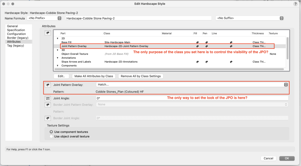 Vectorworks, Inc Employee Katarina Ollikainen Posted March 25 Vectorworks, Inc Employee Share Posted March 25 @Tom W., I believe that the double layer system came from the request (many years ago) to have a gradient in the background and a JPO over that. They should be completely separate settings that have nothing to do with each other regarding attributes. In the image, the basefill is green, the JPO is flagstone and it has its attributes from the AA class (no fill, orange pen). Now, if you use a tile or hatch with background, then you don't need the base fill, as it will cover it. OR, you can just add the tile to the base fill and not use the JPO. That the whole hardscape disappear if you turn off the class you have for the JPO seems buggy - if you do the same with a plant cloud or plant line on a Landscape area, only that part of the object is made invisible. I'll bring this up tomorrow as well. We're creating the features not to rely on class attributes - you should be able to use the objects and set the attributes directly in the style settings instead of having to use classes. Otherwise, you'll need different classes for every combination of attributes. This doesn't mean that you can't use them, only that you shouldn't have to if you want the style to steer the attributes. Let me know if I'm not covering your question. 2 Quote Link to comment