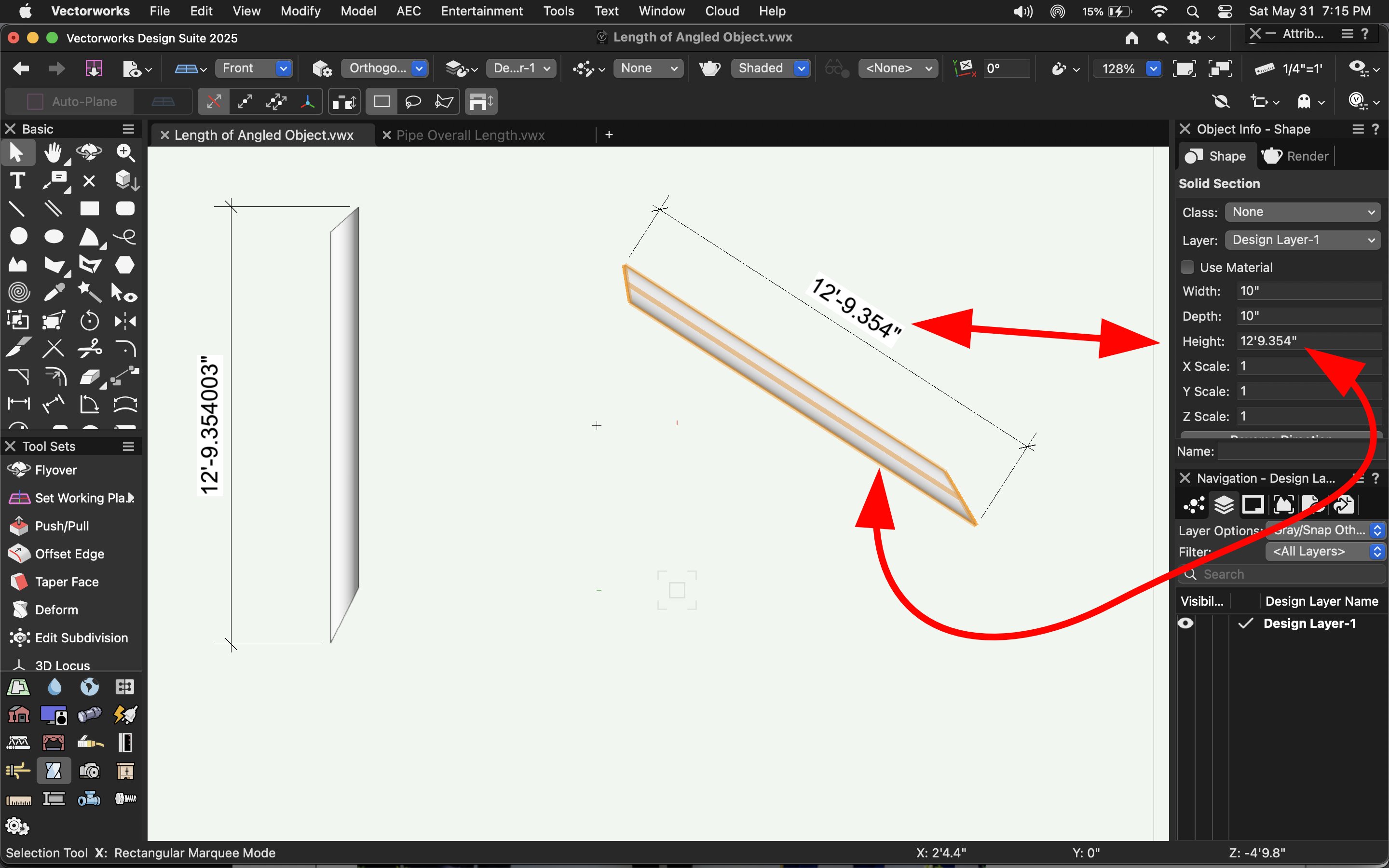 cberg Posted May 30, 2025 Share Posted May 30, 2025 Easy(?) question. Is there a function that will help determine the overall length of a rotated 3d solid? The object in question is a 3D section. Pulling curves off a round extrude (or snapping to edges of cylindrical objects) is difficult in VW. The only way I can find the "out-to-out" length is to find the dimension it in the annotations space of a section viewport. This seems counter-intuitive given Vectorwork's focus on analytics and data. That said, the OIP is incorrect, and the AEC 3D Properties, does not yield the desired results. Is there an easier way to do this? 1 Quote Link to comment